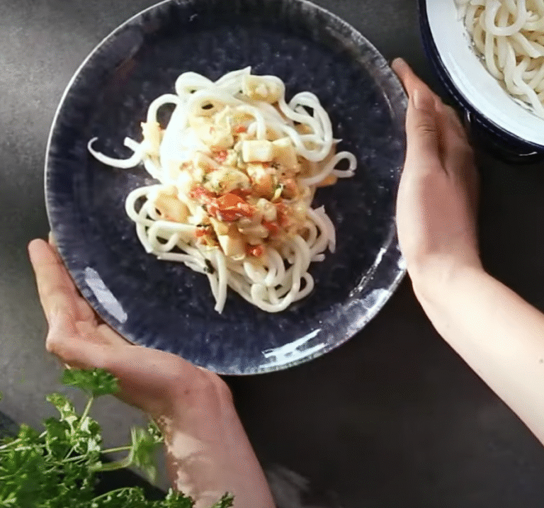 Kalmary z makaronem Udon i serem pleśniowym Lazur Błękitny