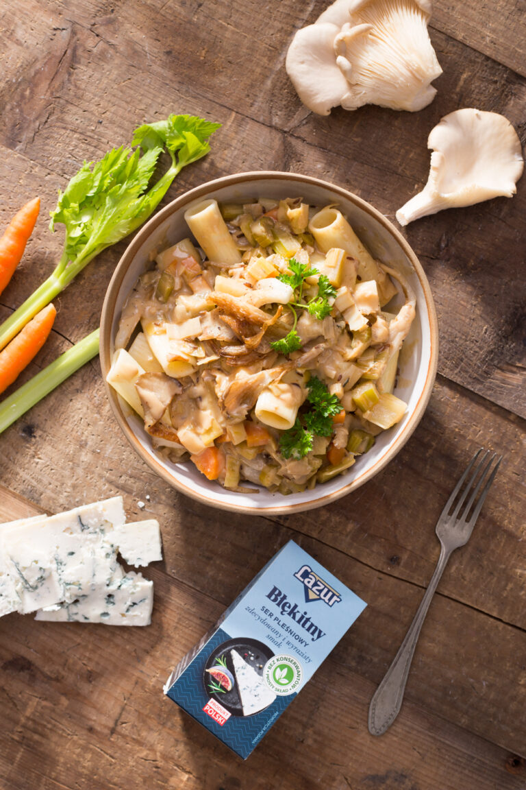 Rigatoni z boczniakami i serem pleśniowym Lazur Błękitny