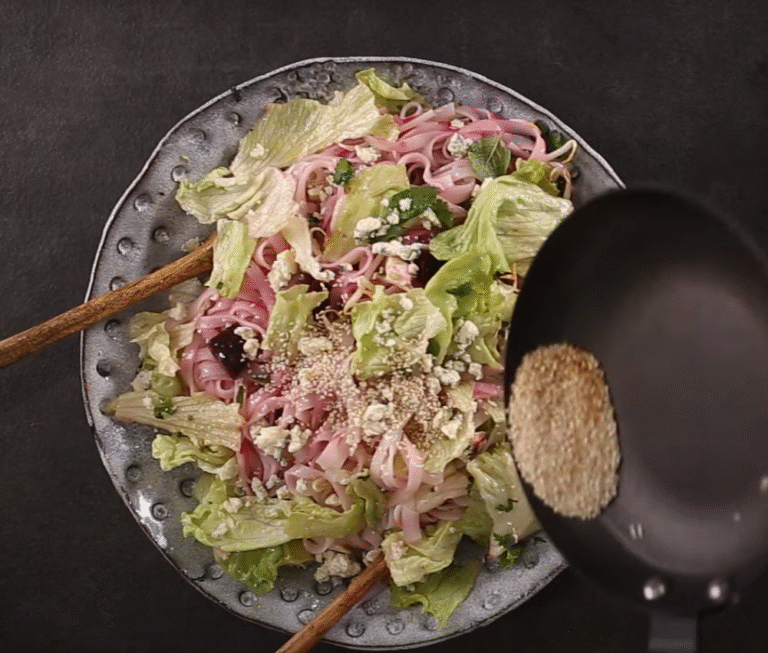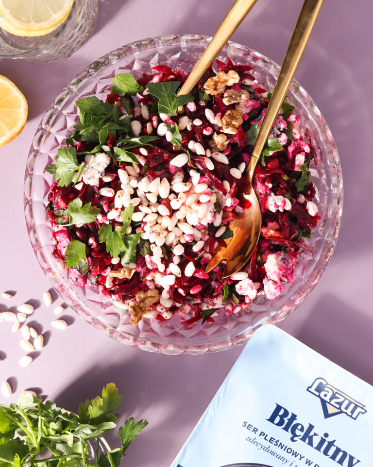 Sałatka z makaronem ryżowym, burakiem i serem pleśniowym Lazur Błękitny