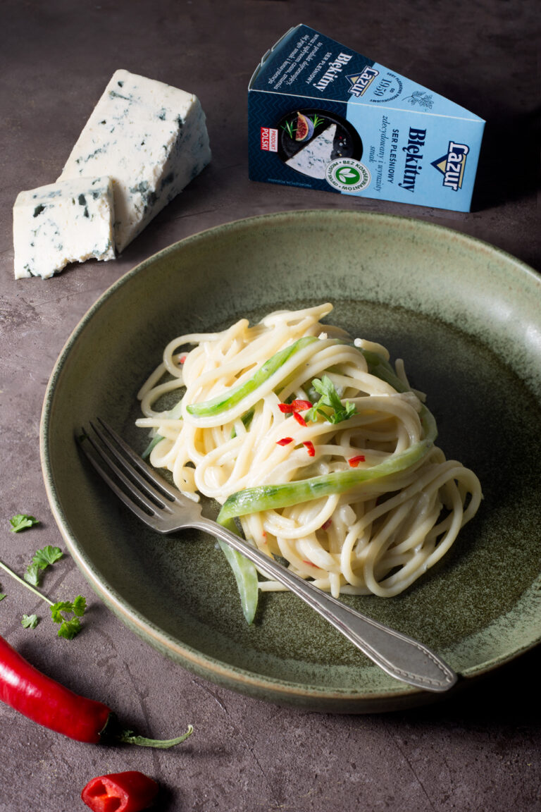 Spaghetti z zielonym ogórkiem i serem pleśniowym Lazur Błękitny