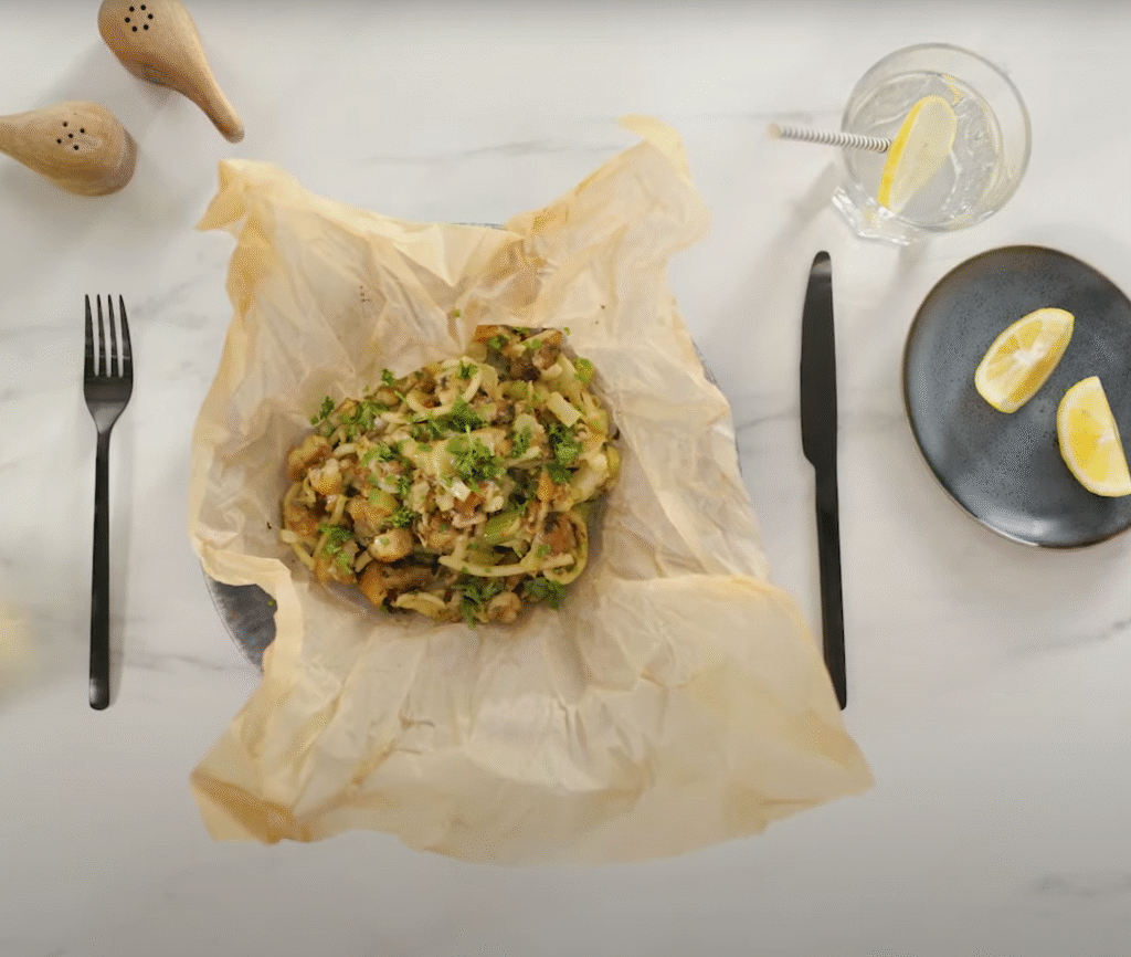 - Rozłożyć cztery porcje dania na osobne arkusze papieru do pieczenia, każdą z porcji szczelnie zawinąć. Piec w rozgrzanym do 220°C piekarniku przez 5-7 minut.