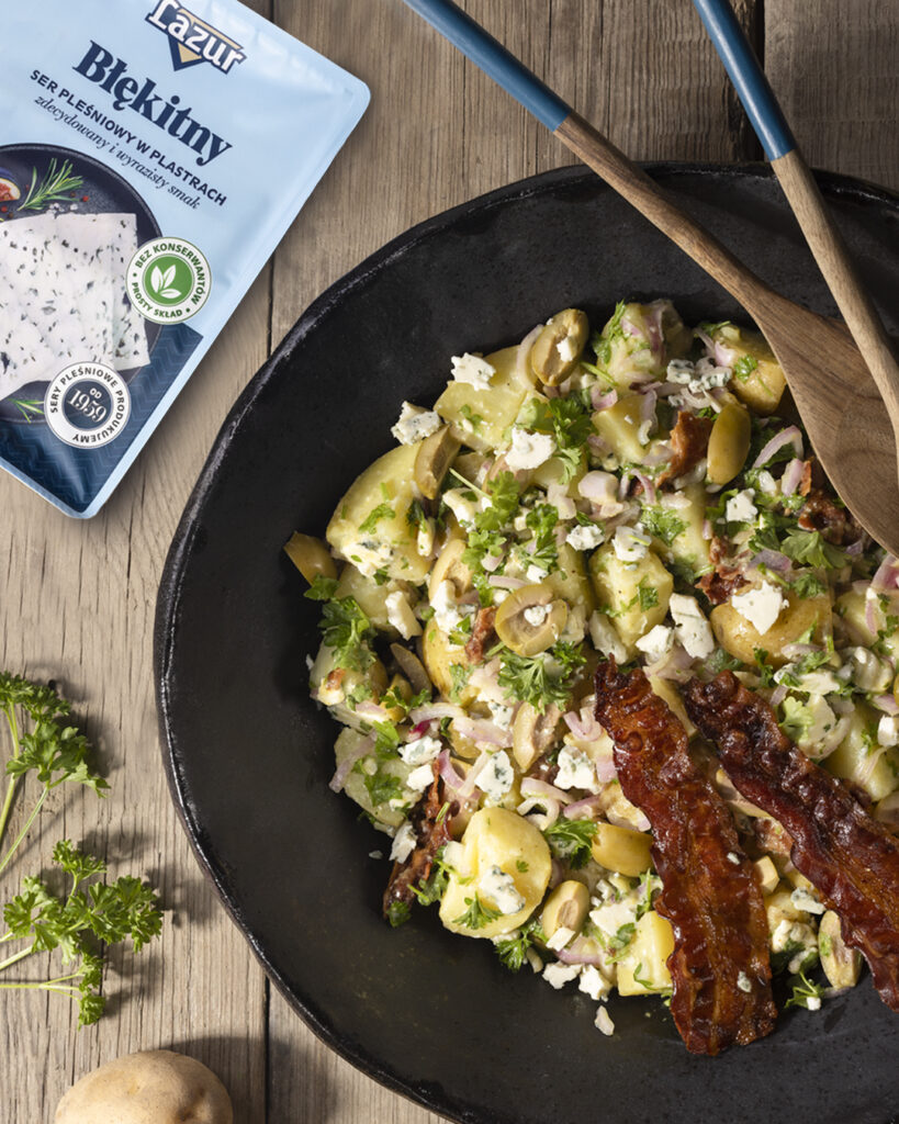 - Ugotowane ziemniaki delikatnie wymieszać z drobno pokrojoną natką pietruszki, plastrami sera pleśniowego, dressingiem i pokrojonym na mniejsze kawałki pieczonym boczkiem.